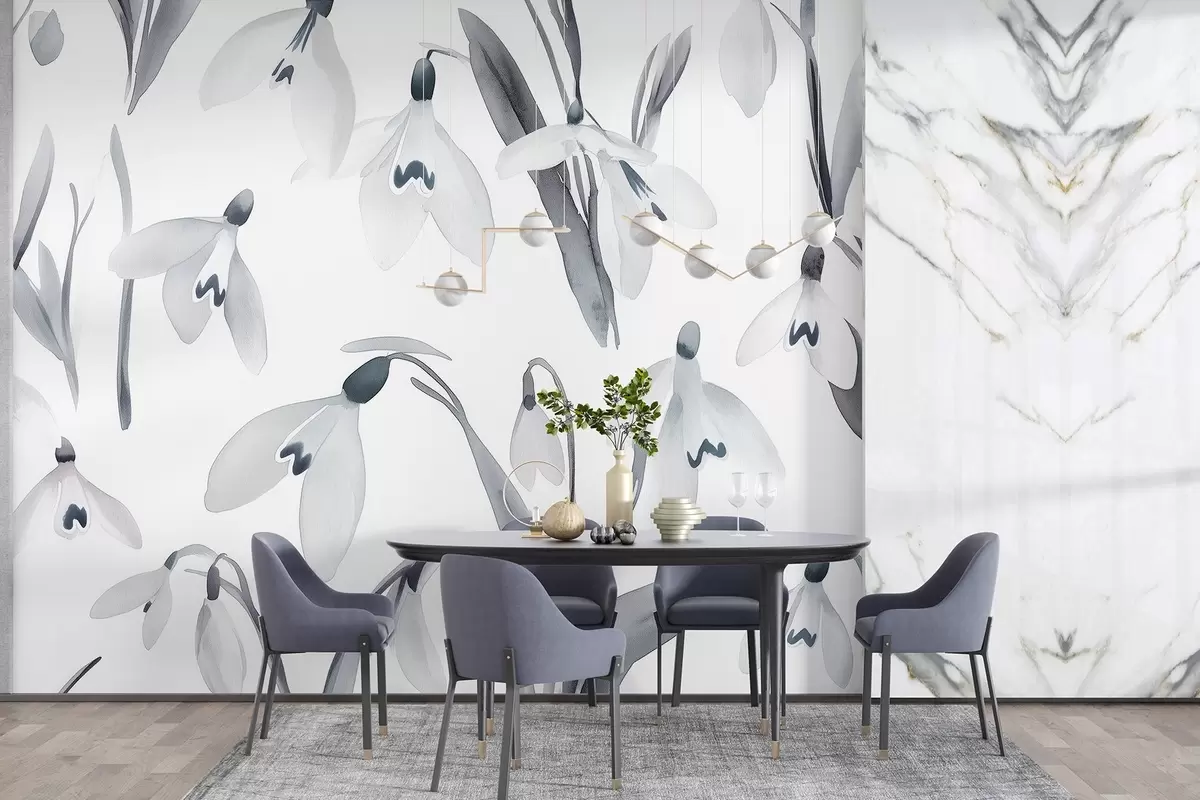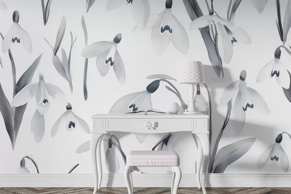 murais de parede Flores Snowdrops em estilo aguarela, cores cinzentas w03754v1