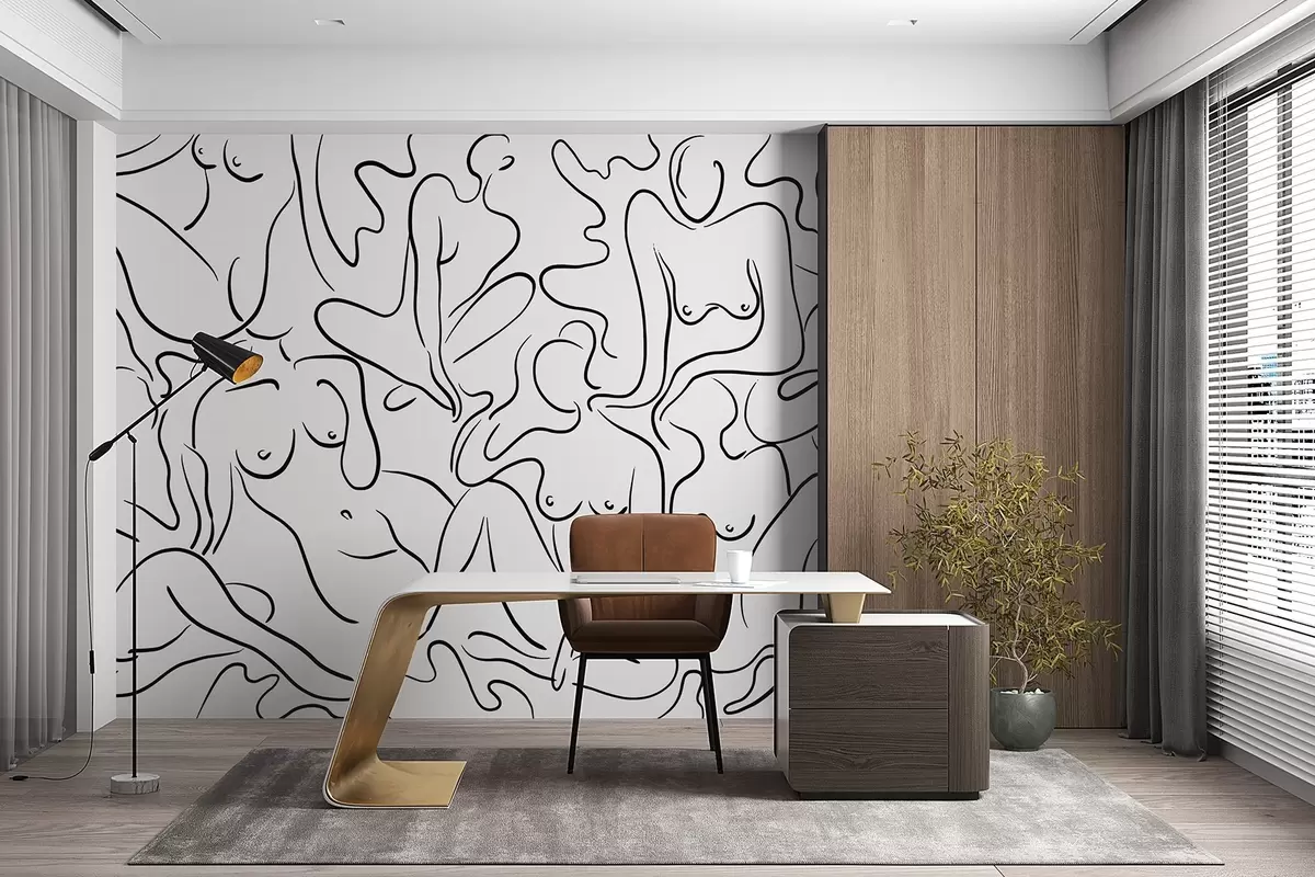 murais de parede Desenho de linhas, silhuetas de corpos de mulheres, abstração, cor preta w03755