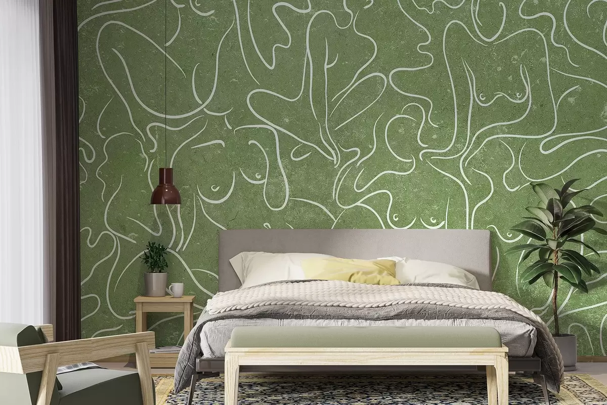 murais de parede Desenho de linhas de silhuetas anatómicas, abstração, fundo verde  w03756v2