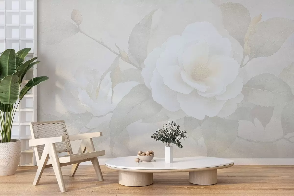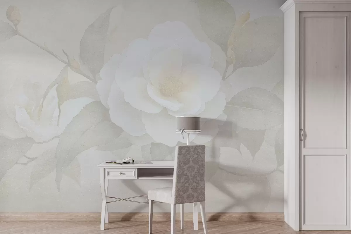 Murais de parede Pastel suave com flores de camélia no ramo, cores bege Nr. w03760