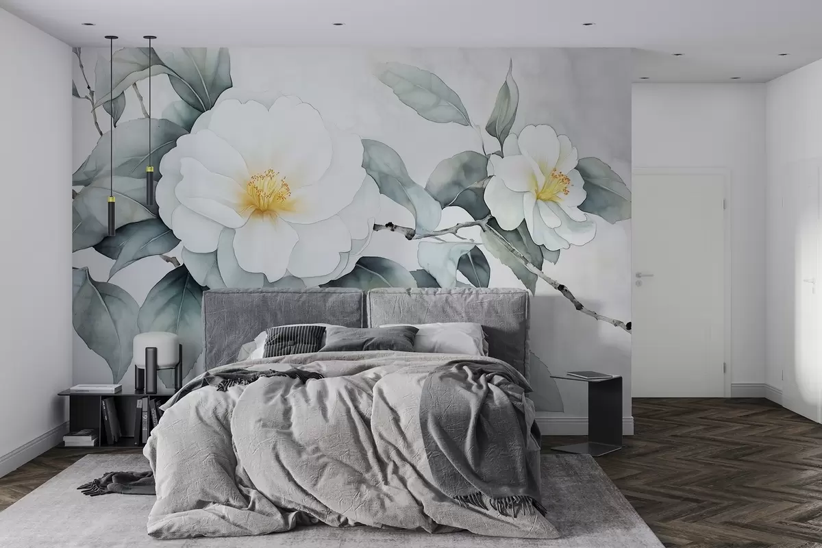 Murais de parede Flores de camélia em estilo aguarela no ramo, cores naturais Nr. w03761