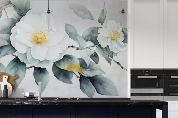 Murais de parede Flores de camélia em estilo aguarela no ramo, cores naturais Nr. w03761