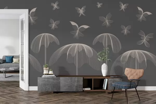 Murais de parede papel de parede linear minimalista borboletas e fontes sobre um fundo cinzento escuro Nr. w03762v1