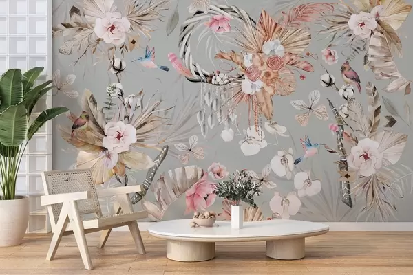 Murais de parede Ornamento estilo Boho com flores de peónia e pássaros, estilo aguarela, cores bege Nr. w03885