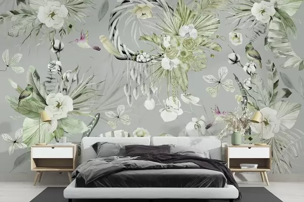 Murais de parede Ornamento estilo Boho com flores de peónia e pássaros, estilo aguarela, cores verdes Nr. w03885v2