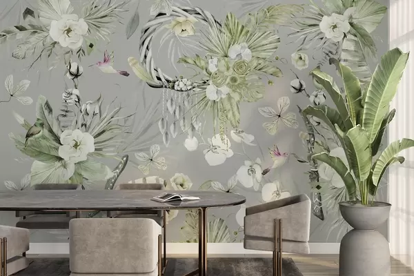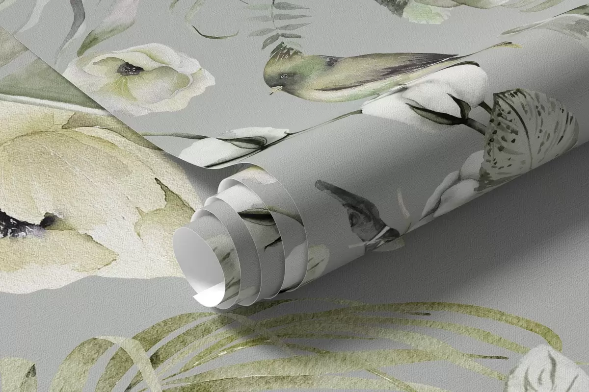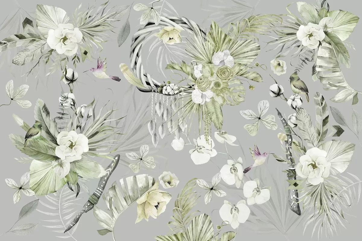 Murais de parede Ornamento estilo Boho com flores de peónia e pássaros, estilo aguarela, cores verdes Nr. w03885v2