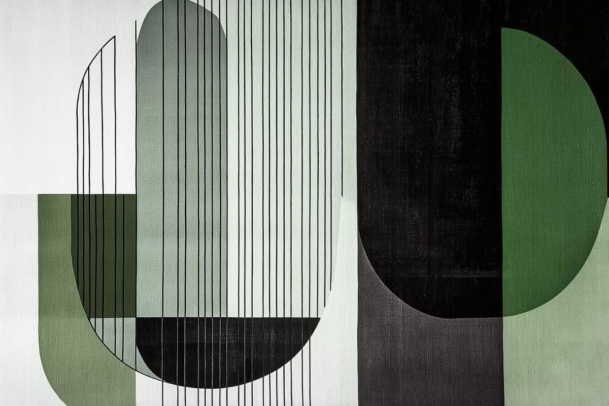 Murais de parede composição geométrica abstrata moderna com formas sobrepostas e padrões de linhas verticais, linhas finas que preenchem trapézios e ovais, sobreposição de textura têxtil suave, tons quentes e suaves como o verde azeitona, o taupe, o bege e o carvão, efeitos de transparência subtis entre formas Nr. w03937v3