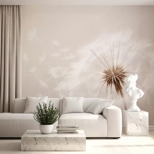 Murais de parede Composição floral moderna e suave com uma cabeça de dente-de-leão totalmente desabrochada e sementes flutuantes, sobre uma delicada textura têxtil Nr. w03939