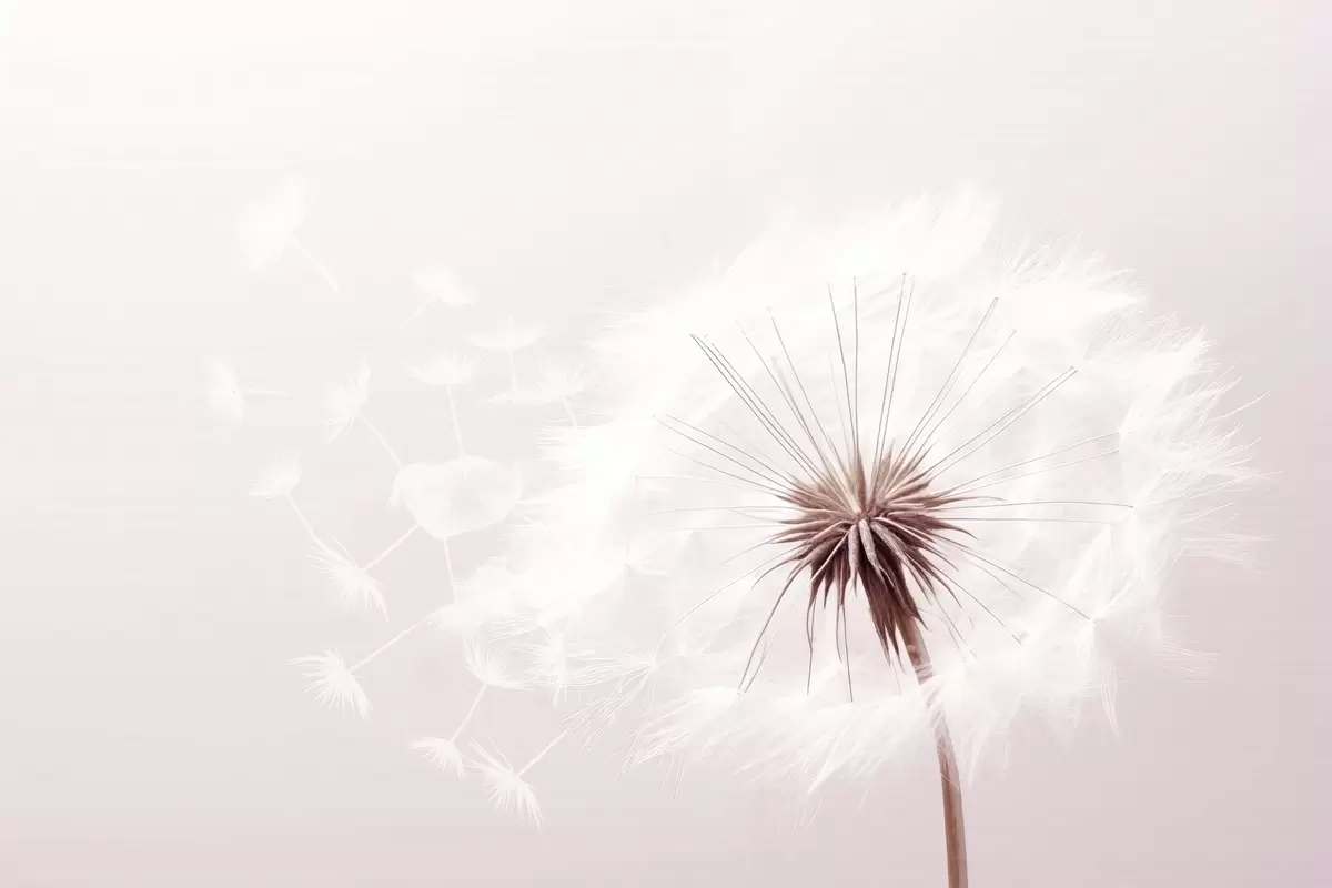 Murais de parede Composição floral moderna e suave com uma cabeça de dente-de-leão totalmente desabrochada e sementes flutuantes, sobre uma delicada textura têxtil Nr. w03939v2