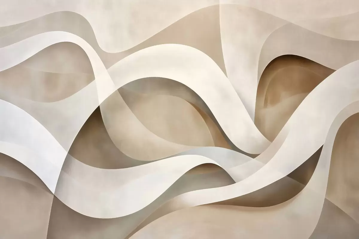 Murais de parede composição minimalista abstrata de formas orgânicas em camadas, cada uma delineada com um rebordo branco suave, preenchida com traços lineares internos densos, como textura de tecido ou papel, curvas fluidas em tons neutros de bege, areia, pedra e marfim, aspeto em relevo Nr. w03940