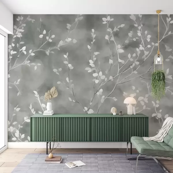 Murais de parede papel de parede minimalista pintado à mão, com ramos de árvores brancas e folhas delicadas, que se ramificam organicamente sobre um fundo verde-salvo, com linhas botânicas finas e fluxo natural Nr. w03949v2