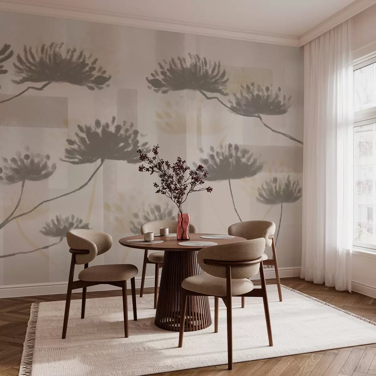 Murais de parede geometria texturada em tons de bege e creme com flores de guarda-chuva estilizadas Nr. w03960