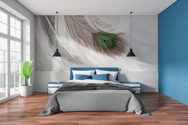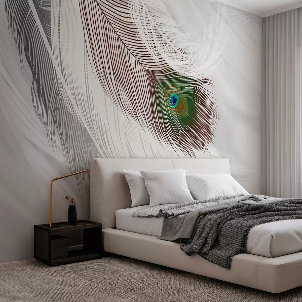 Murais de parede uma grande pena de pavão entre as penas Nr. w03961
