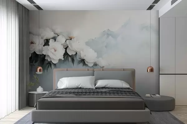 murais de parede pitorescas peónias brancas e exuberantes contra o pano de fundo de montanhas enevoadas w03965