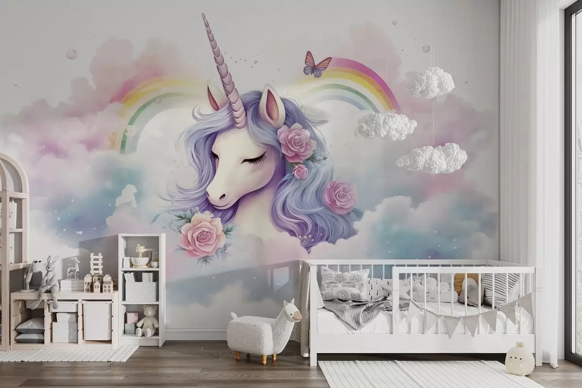 Murais de parede Unicórnio pastel nas nuvens com arco-íris e rosas Nr. w03990