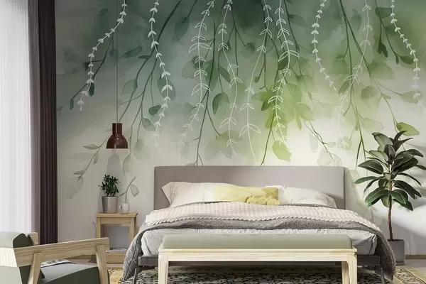 Murais de parede Ramos com folhas em estilo aguarela, cores verdes naturais Nr. w04007