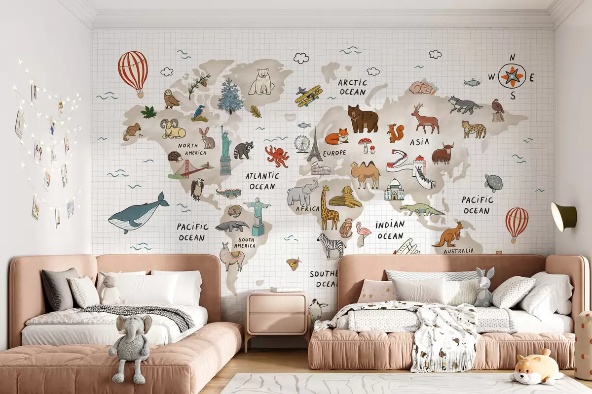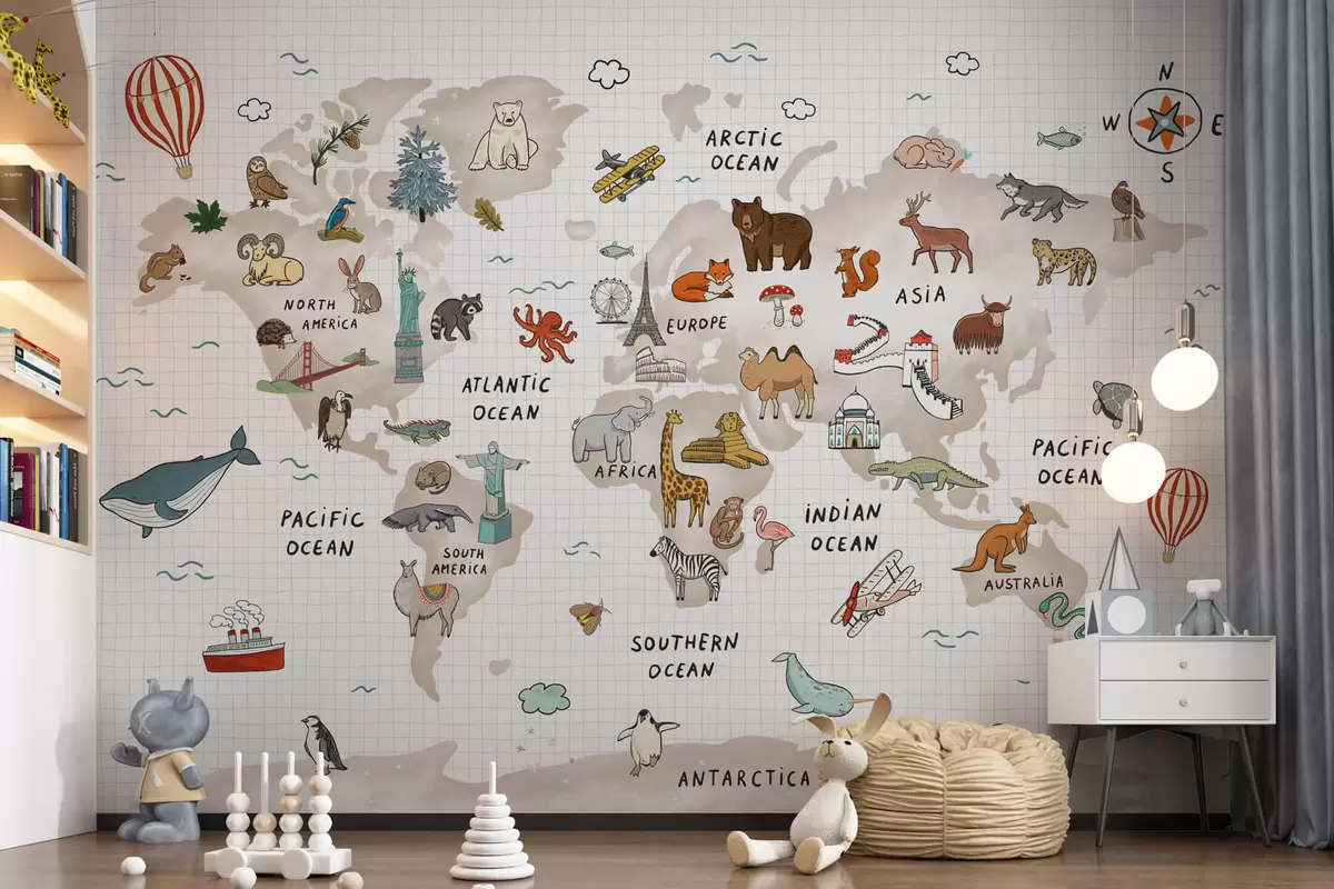 Murais de parede Mapa-mundo com animais e pontos de referência Nr. w04011