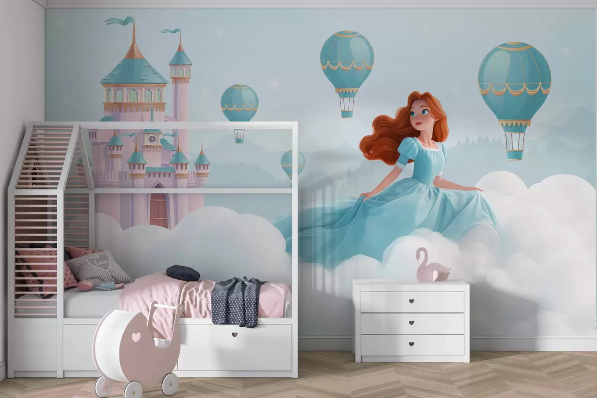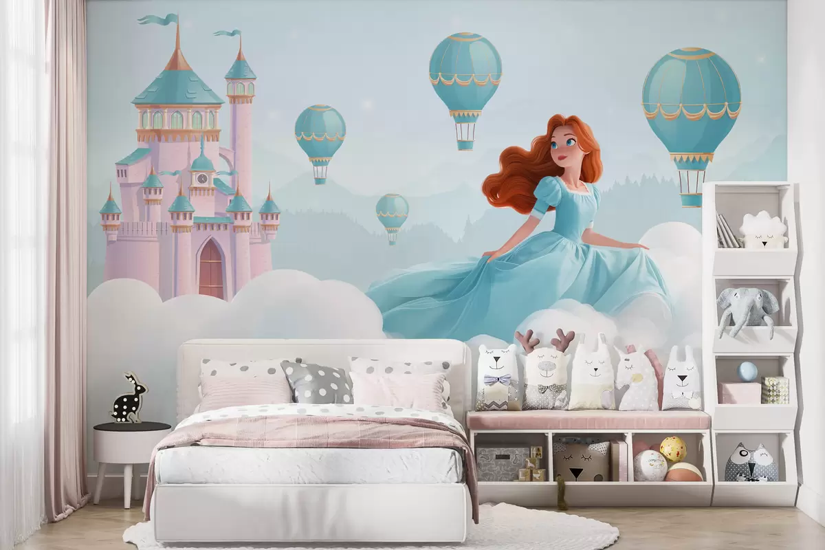 Murais de parede Princesa entre as nuvens no fundo da paisagem com o castelo Nr. w04015
