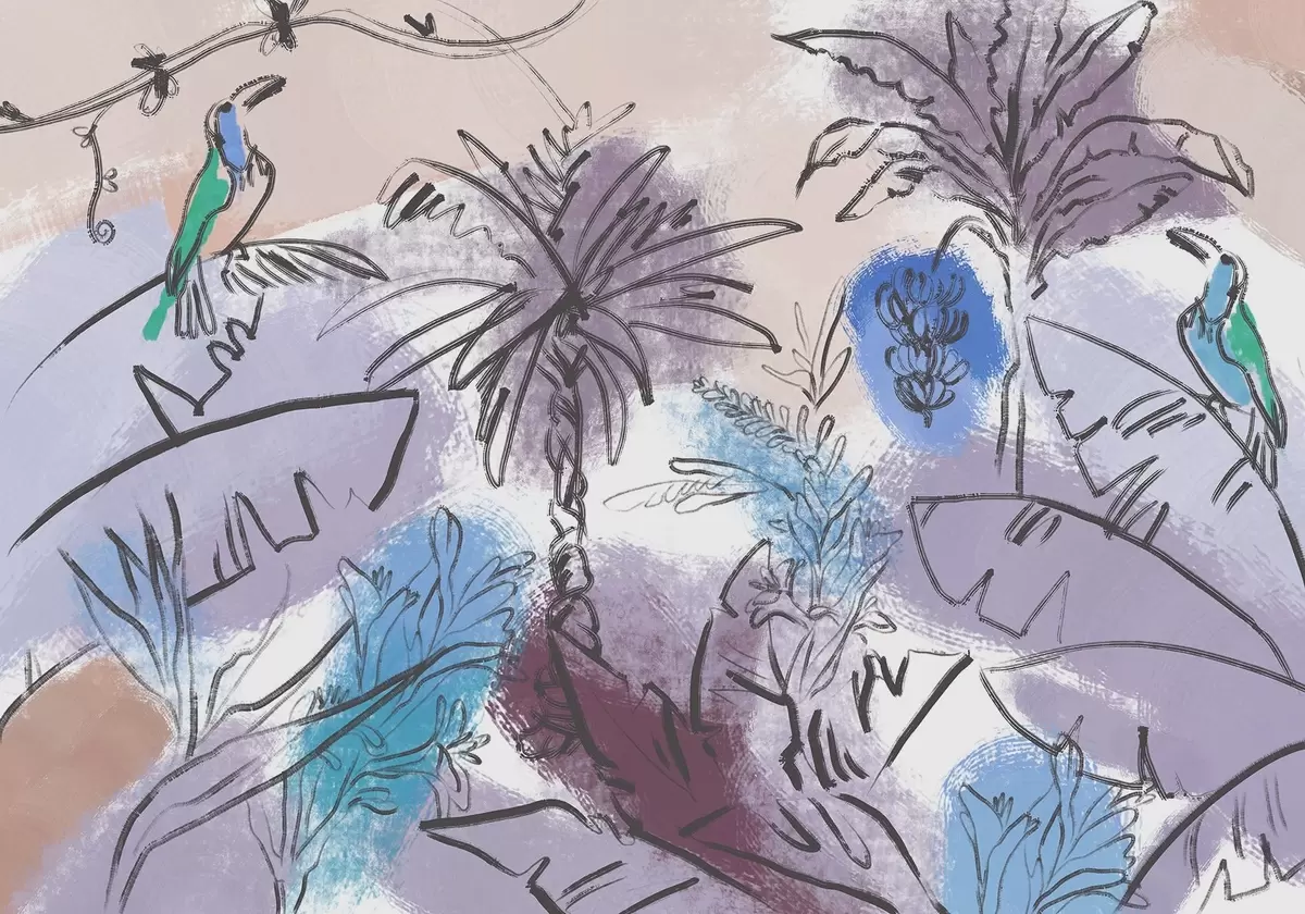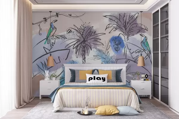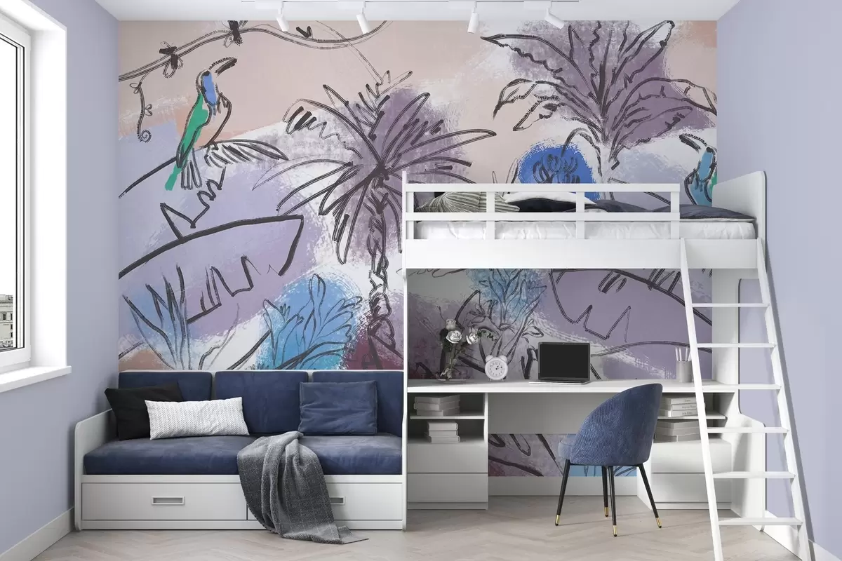 Murais de parede Estampado tropical com flores azuis, papagaios pitorescos Nr. w04019v2