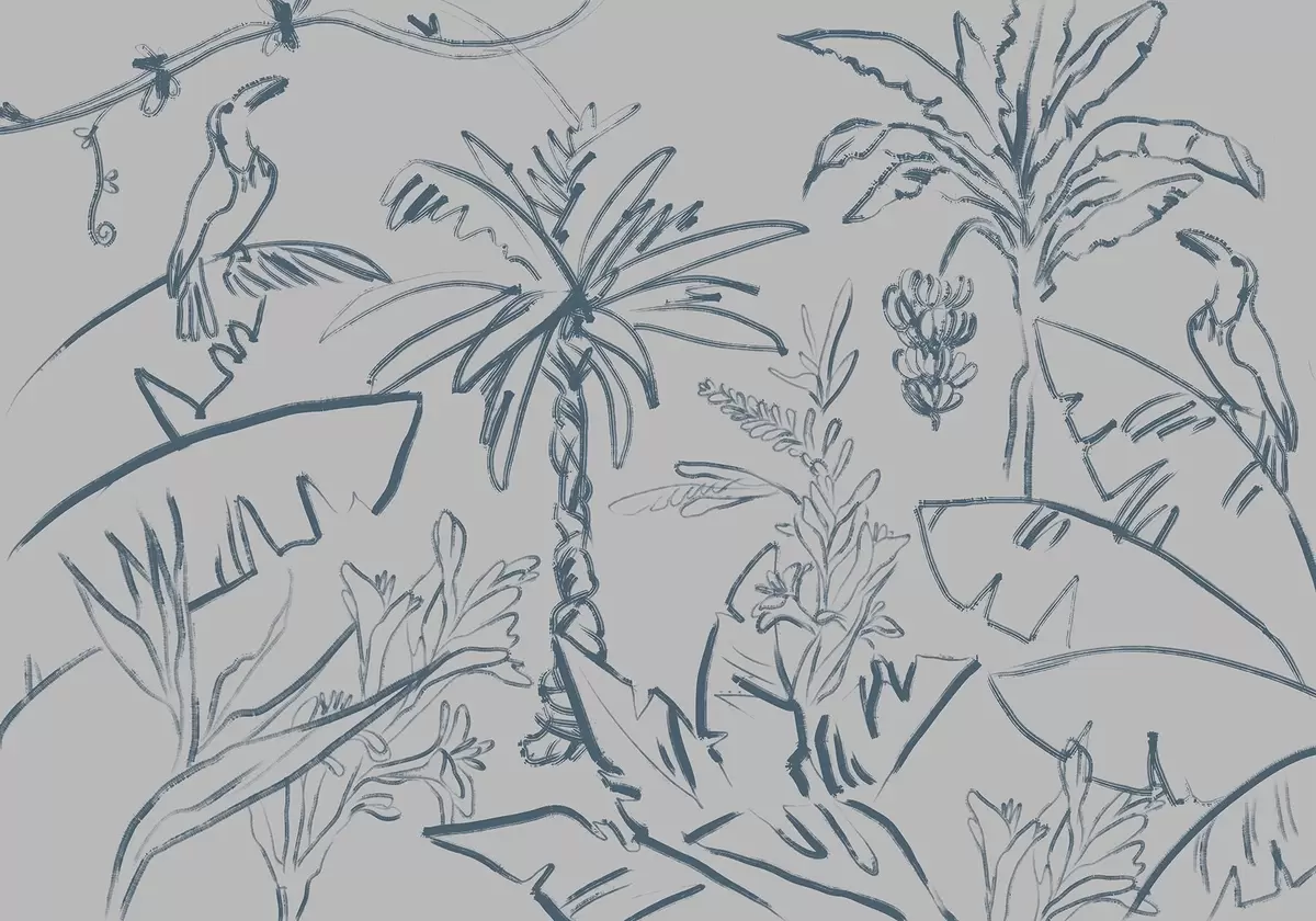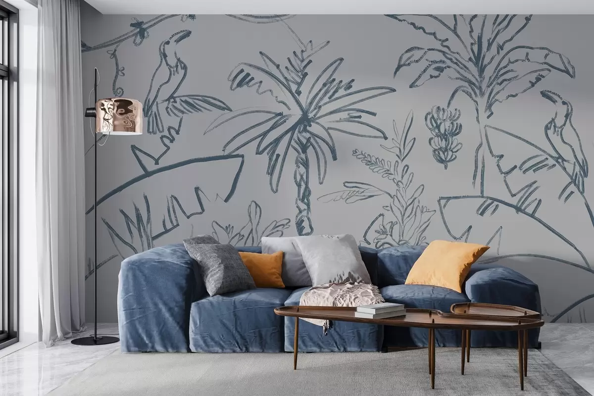 Murais de parede Padrão tropical em azul, bananas, palmeiras Nr. w04020v1