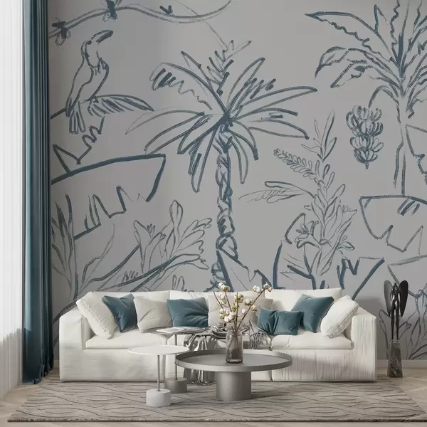 Murais de parede Padrão tropical em azul, bananas, palmeiras Nr. w04020v1