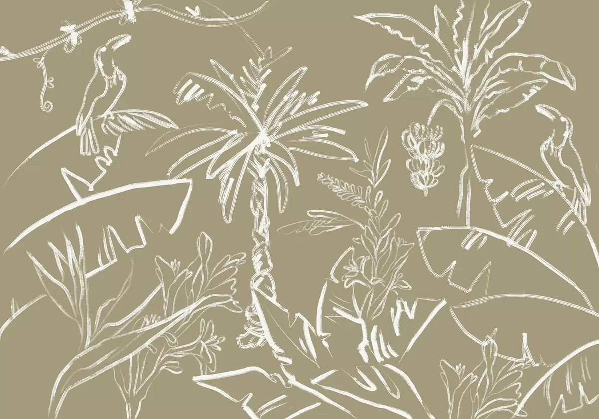 Murais de parede Padrão tropical sobre fundo castanho azeitona, palmeiras, bananas Nr. w04020v3