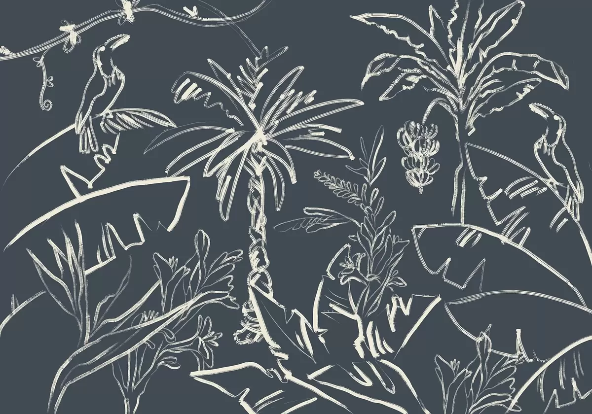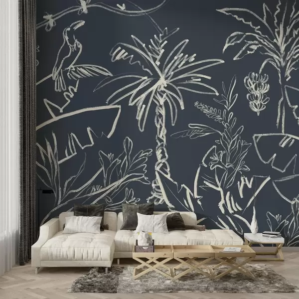 Murais de parede Padrão tropical sobre fundo azul escuro, palmeiras, bananas Nr. w04020v4