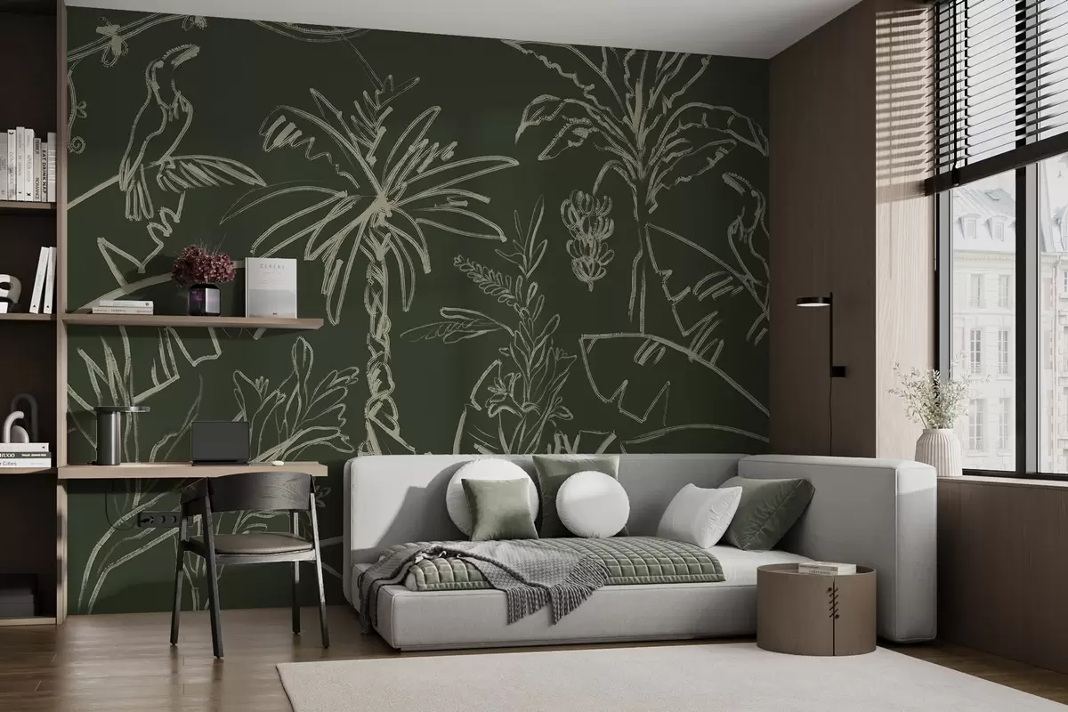 Murais de parede Padrão tropical sobre fundo verde escuro, palmeiras, bananas Nr. w04020v5