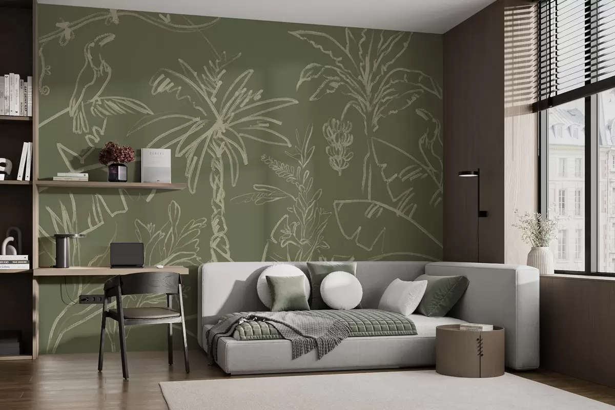 Murais de parede Padrão tropical sobre fundo verde, palmeiras, bananas Nr. w04020v6
