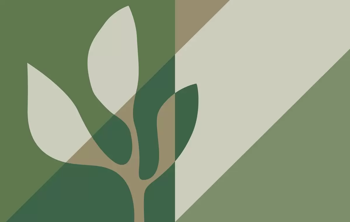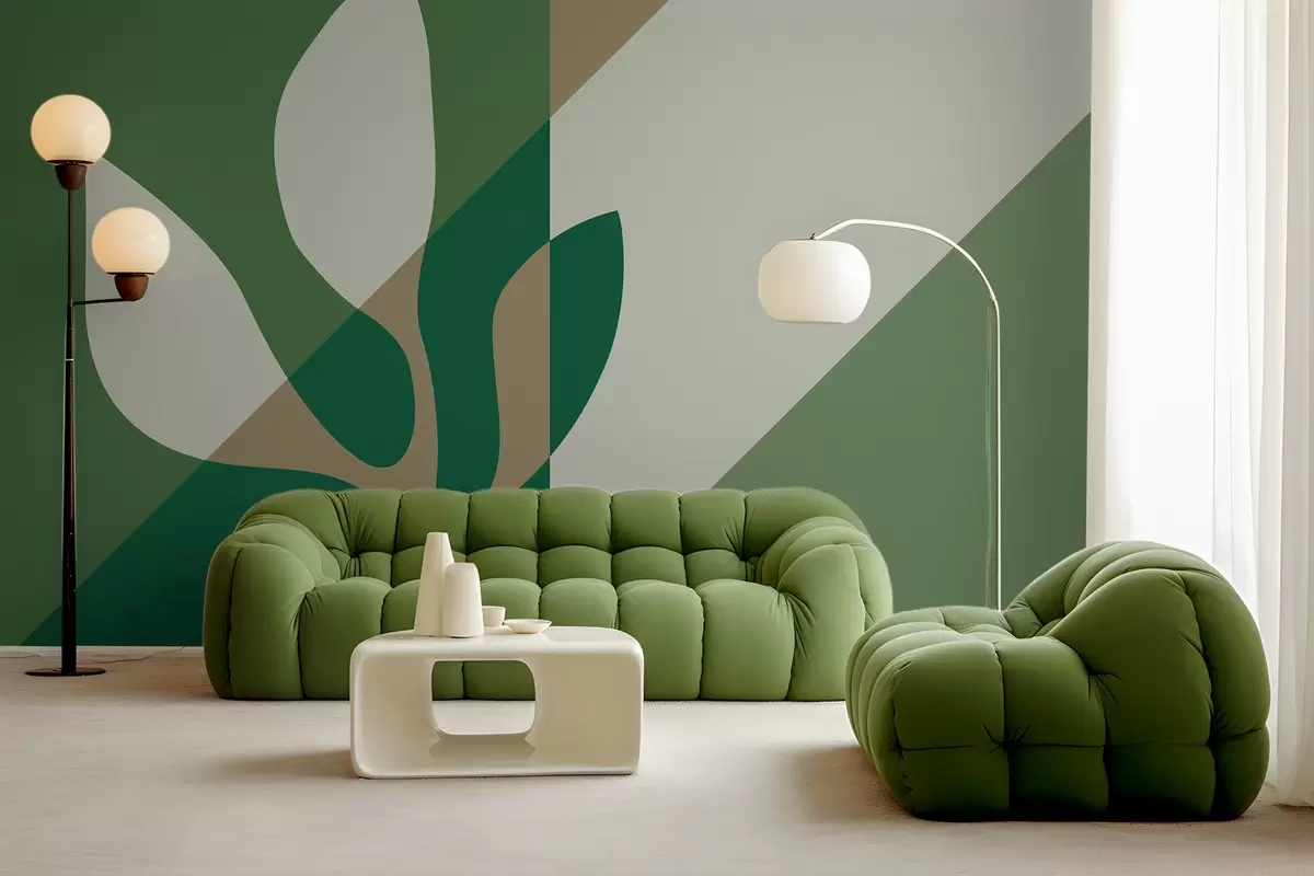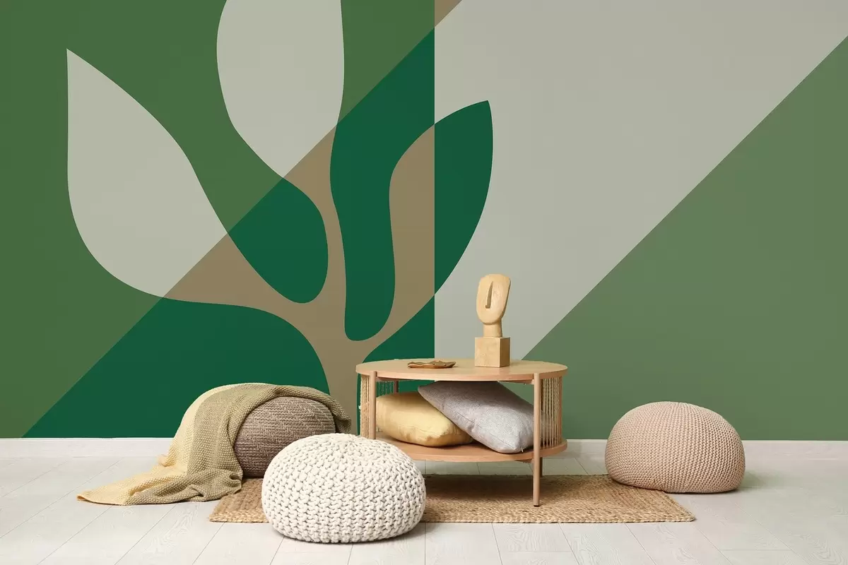 Murais de parede planta gráfica abstrata sobre um fundo geométrico de cor verde e ocre Nr. w04028