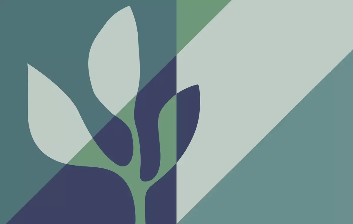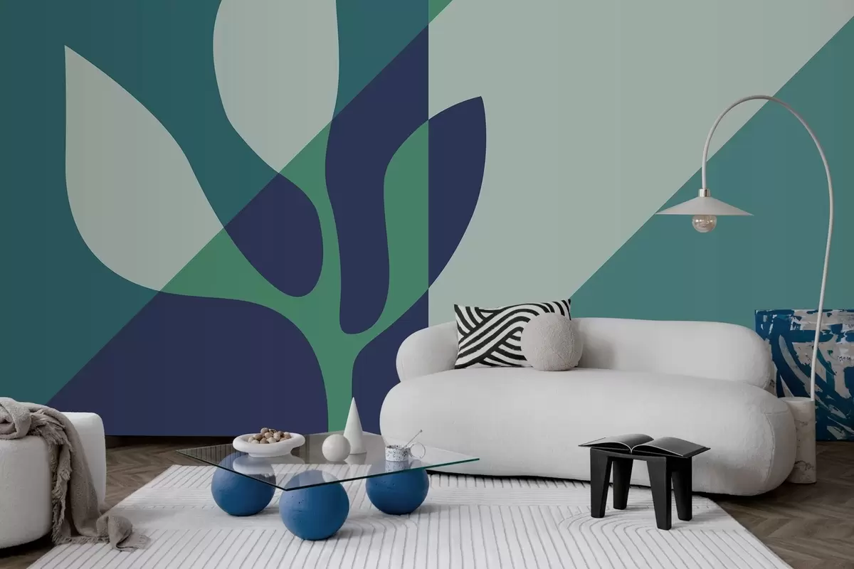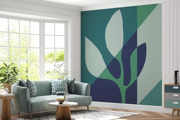 Murais de parede planta gráfica abstrata sobre fundo geométrico em tons de azul Nr. w04028v1