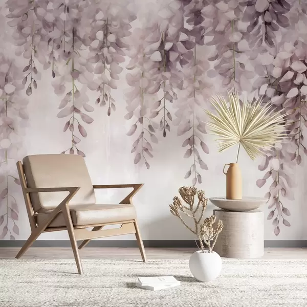 Murais de parede Cena de aguarela suave em tons de rosa cremoso, com cachos de glicínias em cascata formando uma cortina floral de sonho Nr. w04034v2