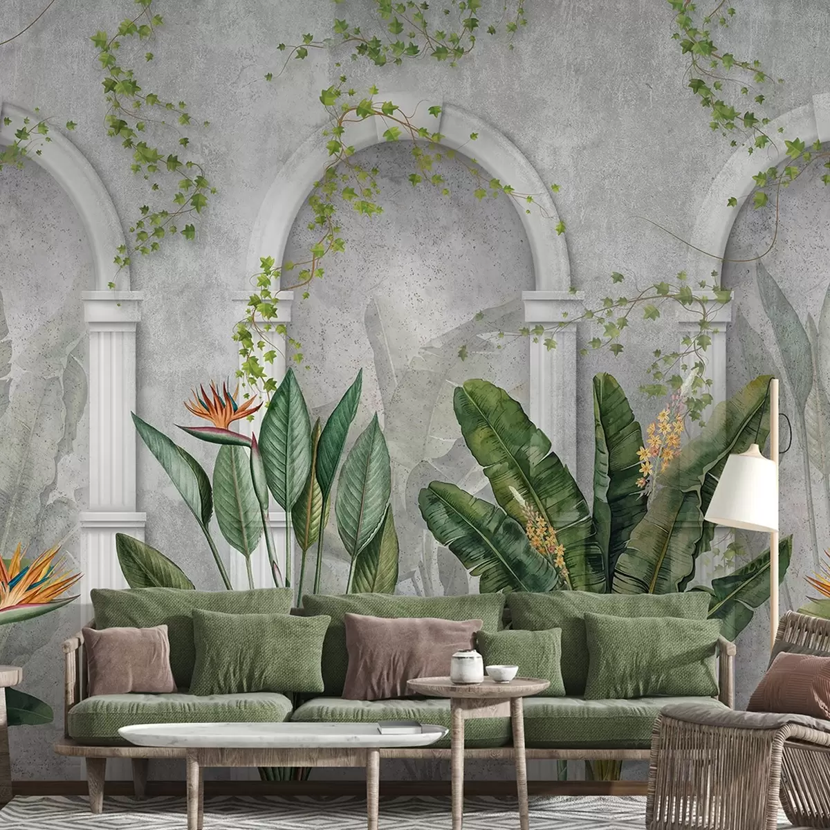 Murais de parede Parede de betão com arcos e plantas tropicais, florais, cores naturais Nr. w04065
