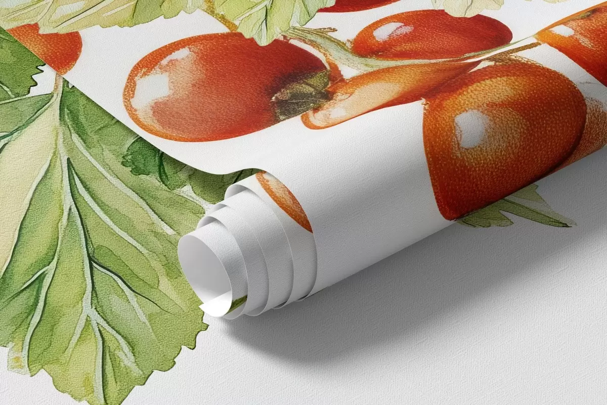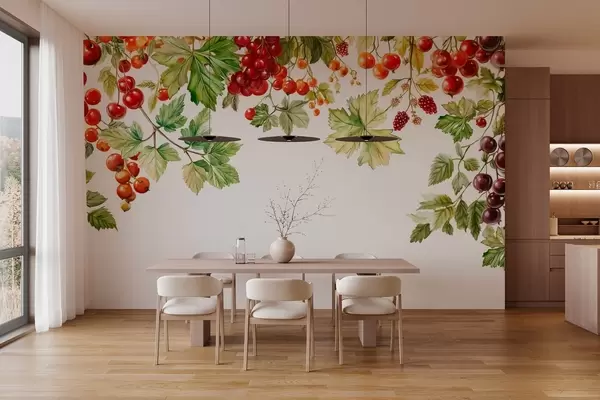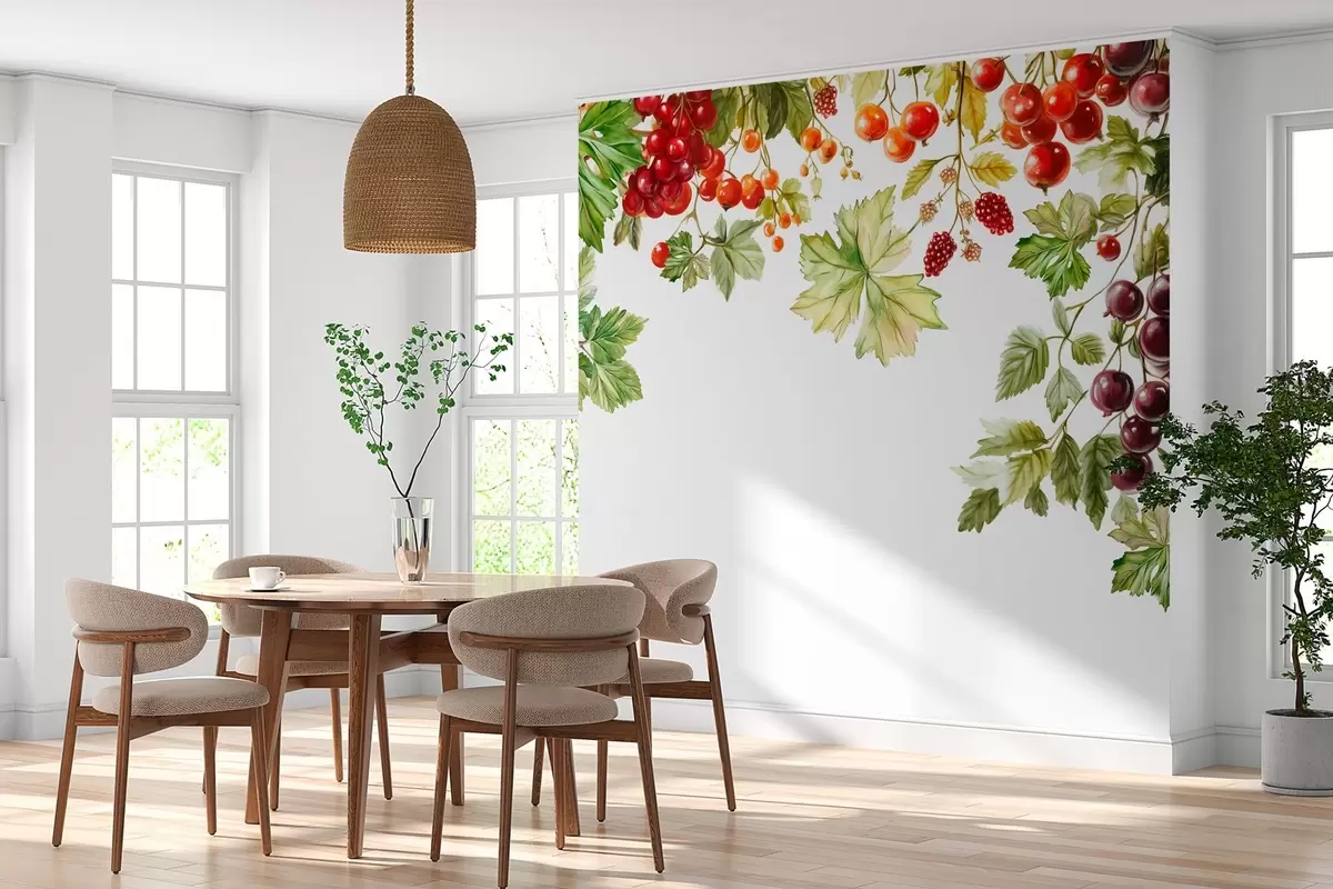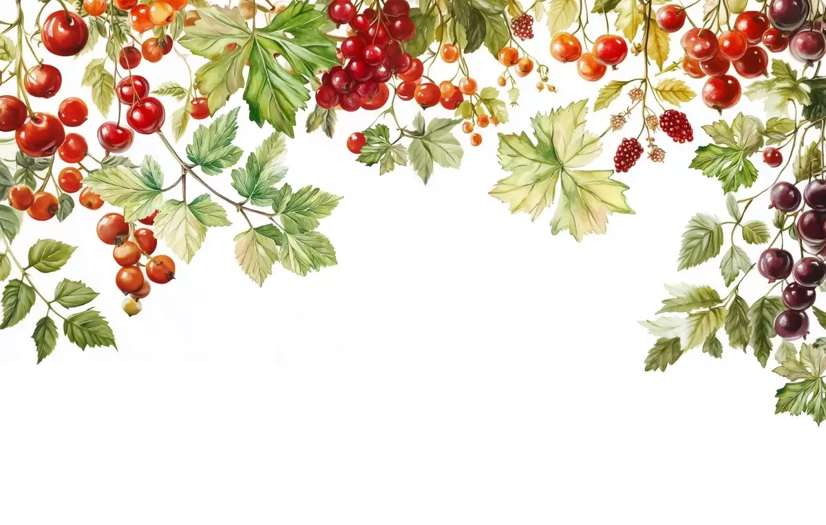 Murais de parede cachos de groselhas pendurados no topo, em estilo aguarela, sobre um fundo branco Nr. w04073