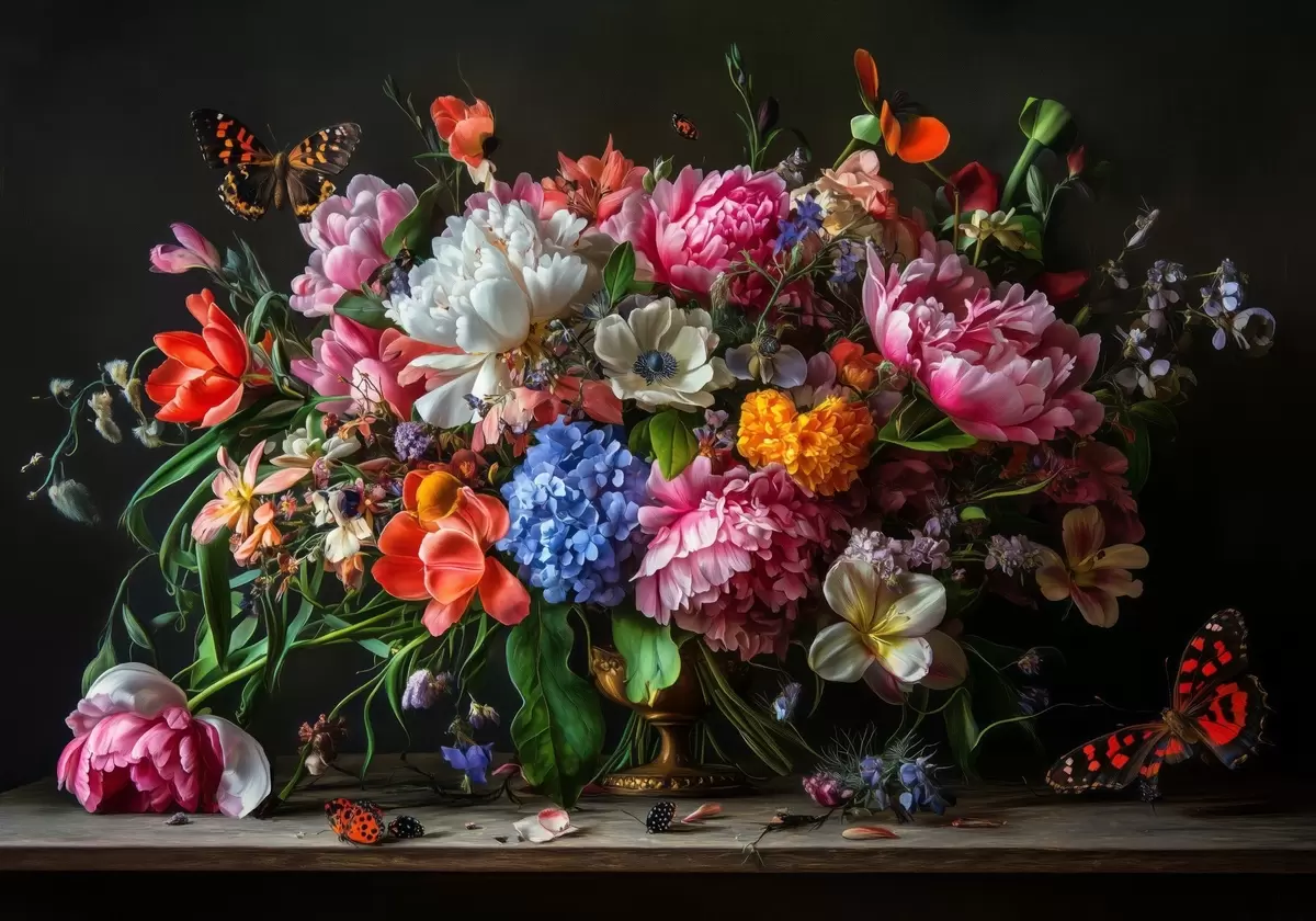 Murais de parede bouquet ao estilo da pintura a óleo holandesa do século XVII com uma luxuosa composição floral. Nr. w04078