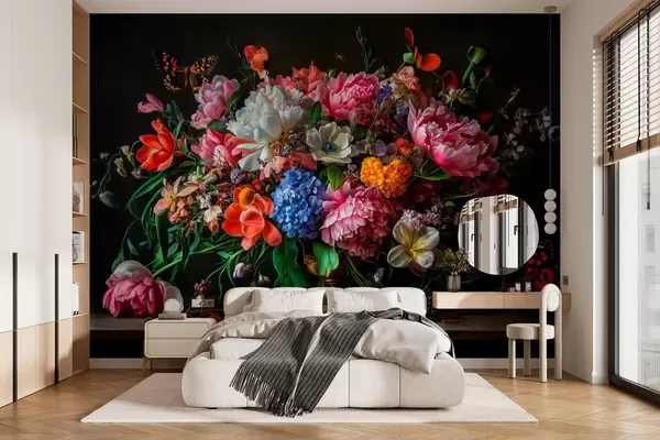 Murais de parede bouquet ao estilo da pintura a óleo holandesa do século XVII com uma luxuosa composição floral. Nr. w04078