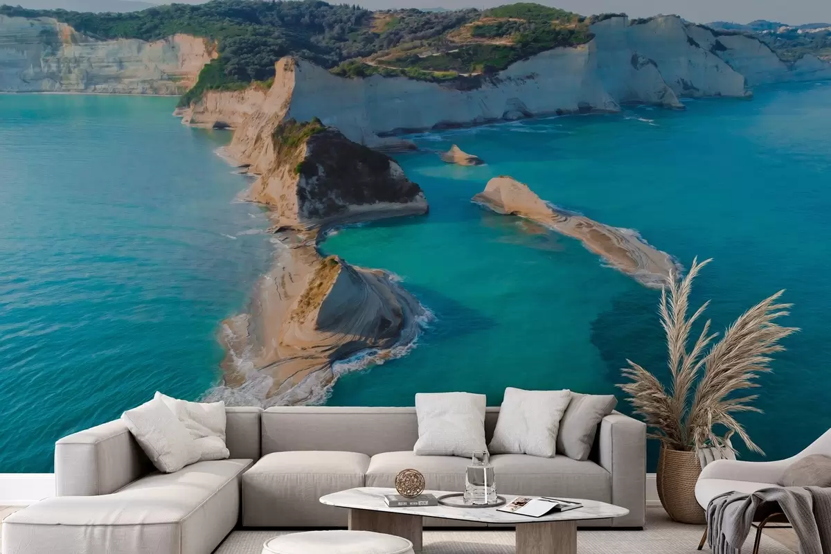 Murais de parede Ilha grega, textura a óleo, costa marítima, água azul-marinho, realismo Nr. w04094