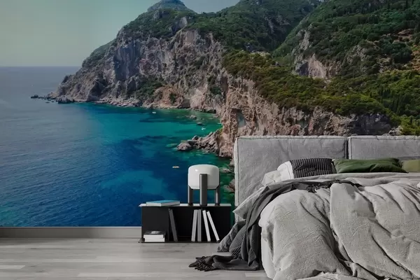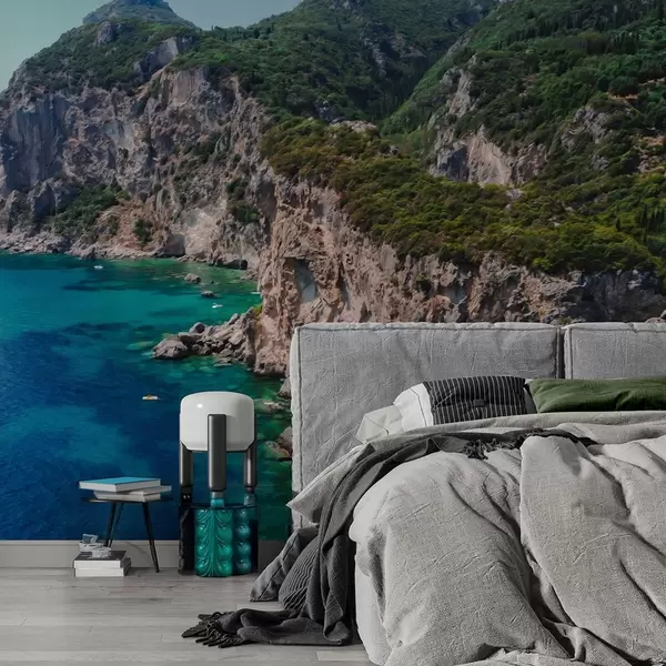 Murais de parede Montanhas rochosas perto do mar, desenho a óleo, água azul-marinho Nr. w04096