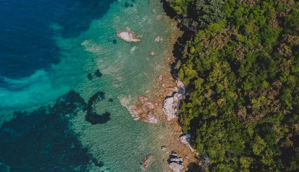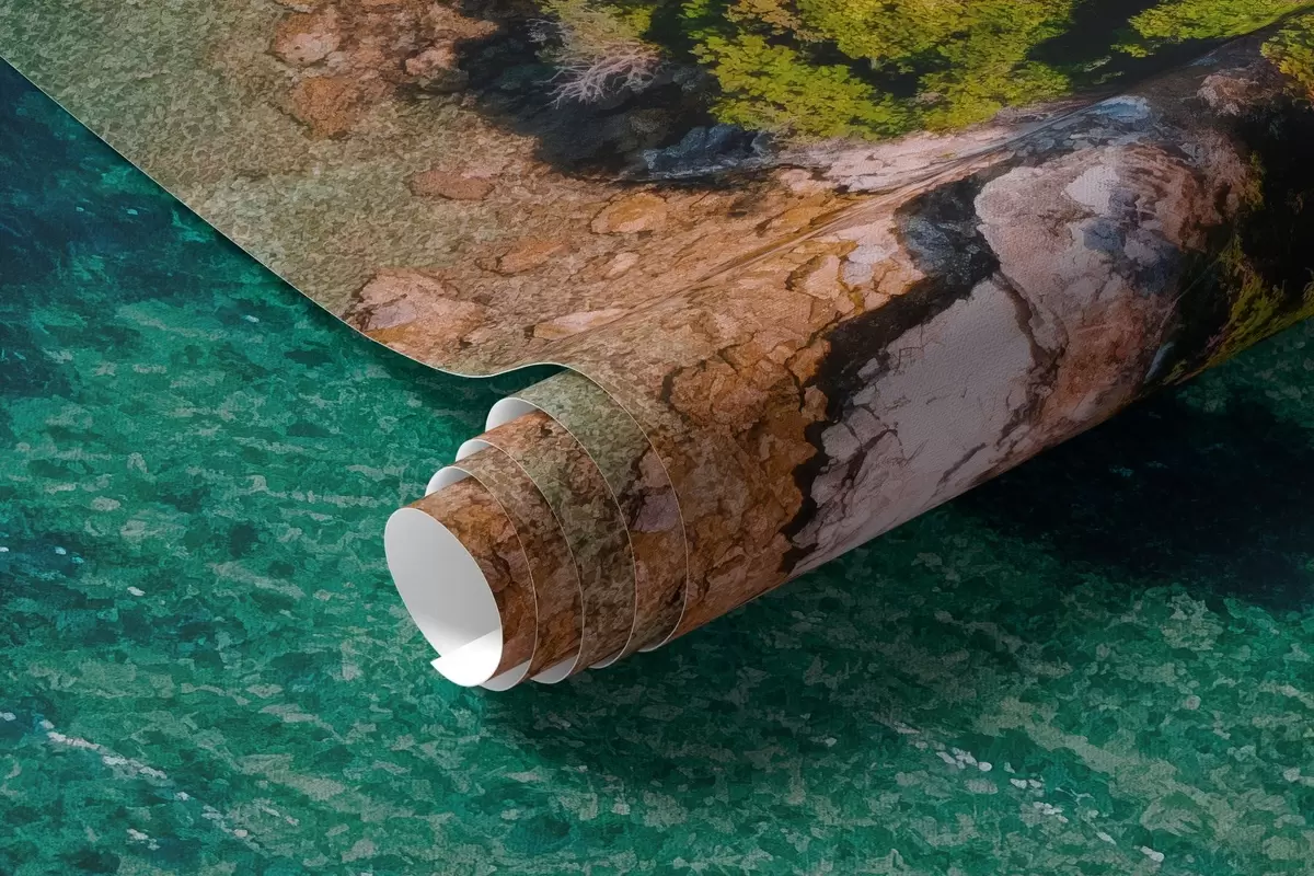 Murais de parede Costa marítima de Espanha com água do mar, floresta de pinheiros, fotografia aérea Nr. w04099