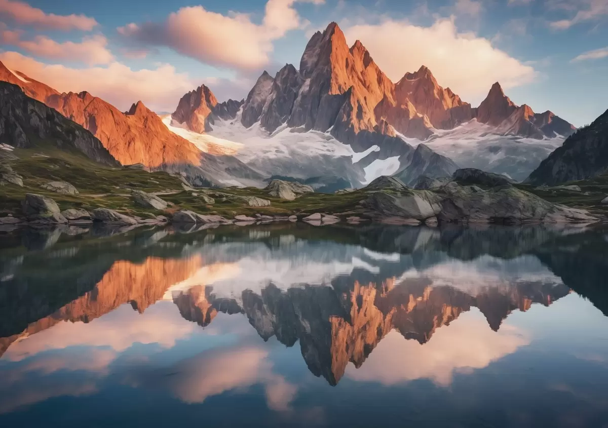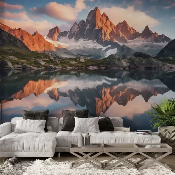 Murais de parede Montanhas ao amanhecer, reflexo na água, paisagem realista Nr. w04150