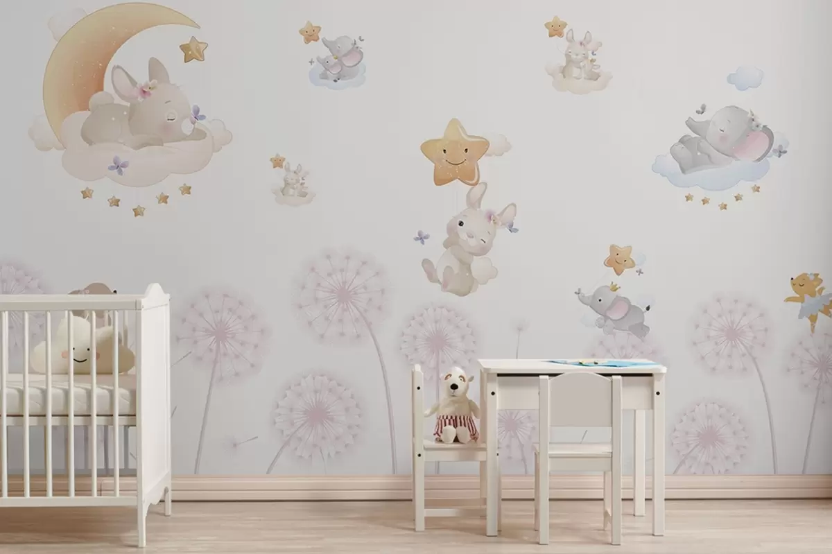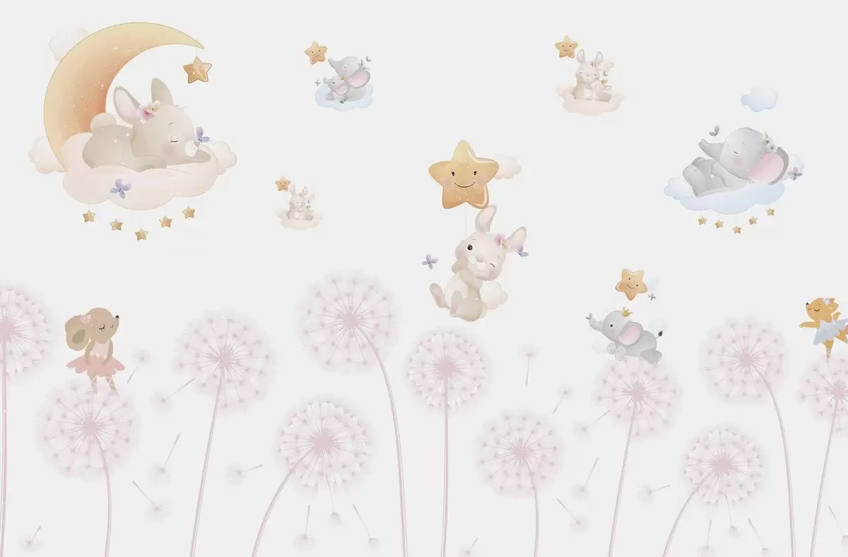 Murais de parede Coelho giro e estrelas entre dentes-de-leão sobre um fundo branco Nr. w04195
