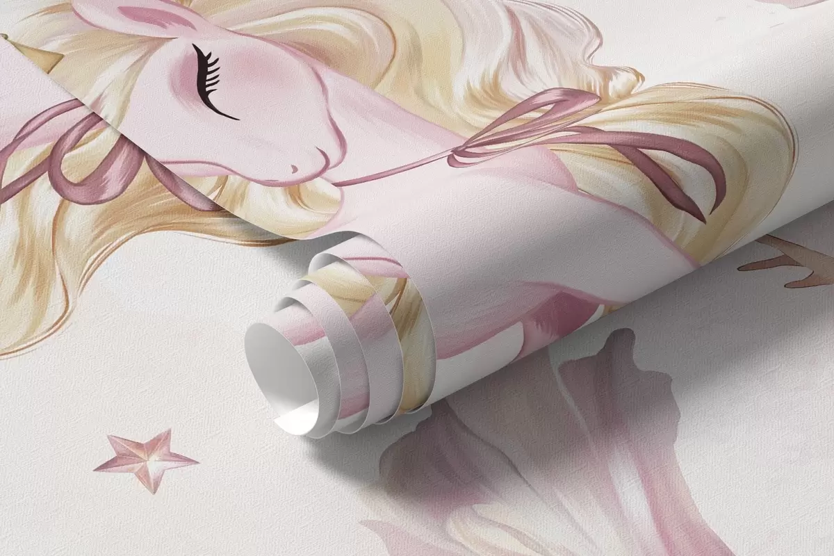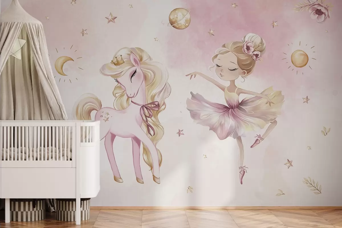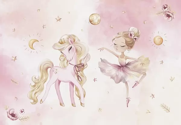 Murais de parede Unicórnio e bailarina num conto de fadas cor-de-rosa, história para crianças Nr. w04196