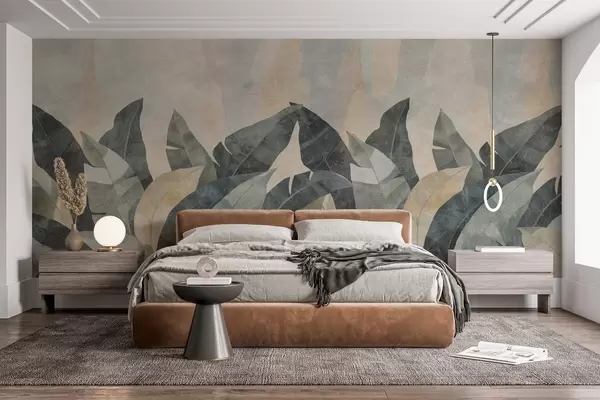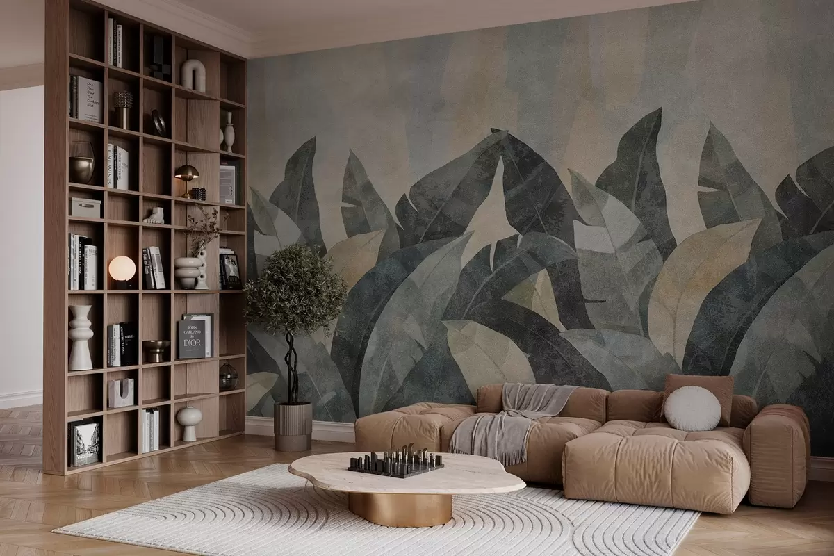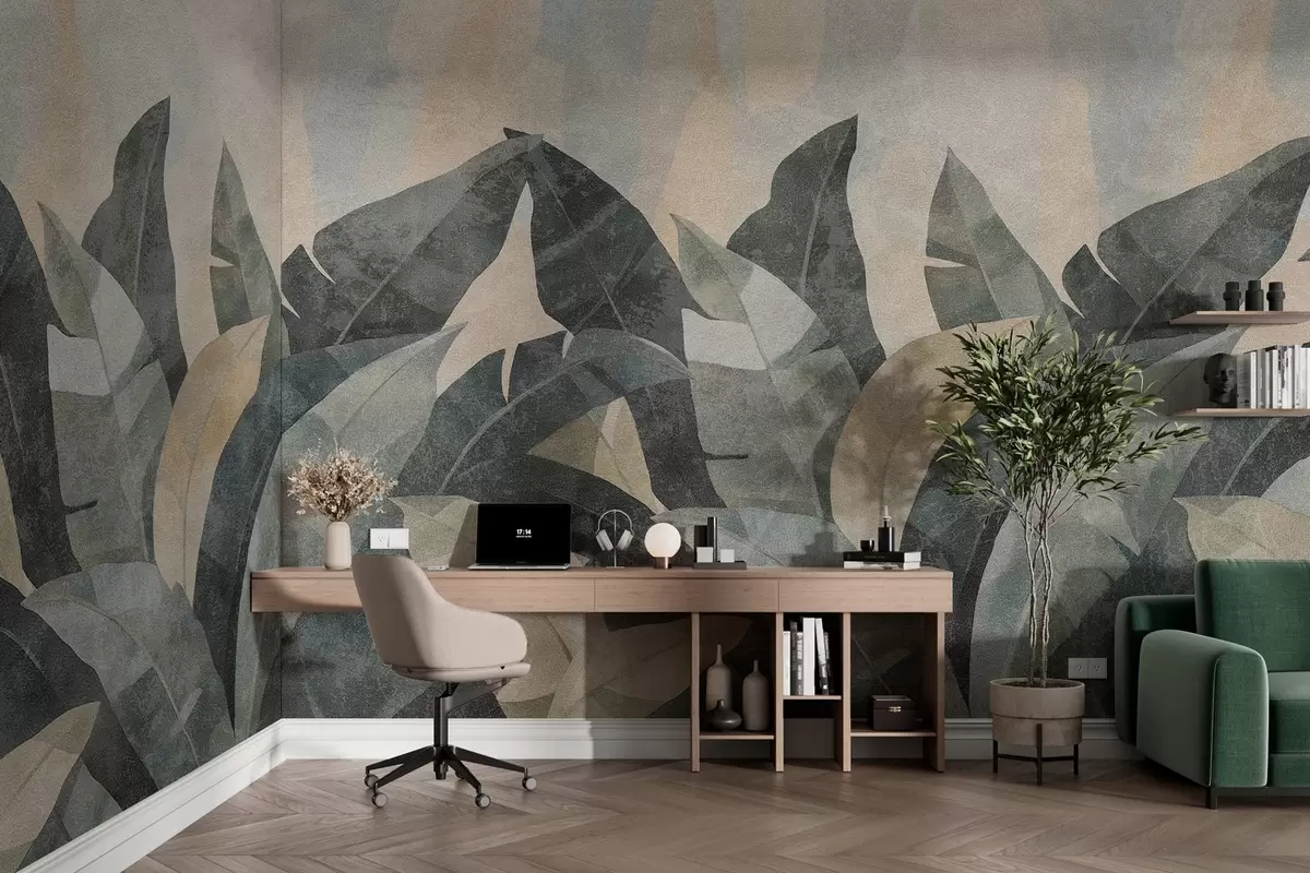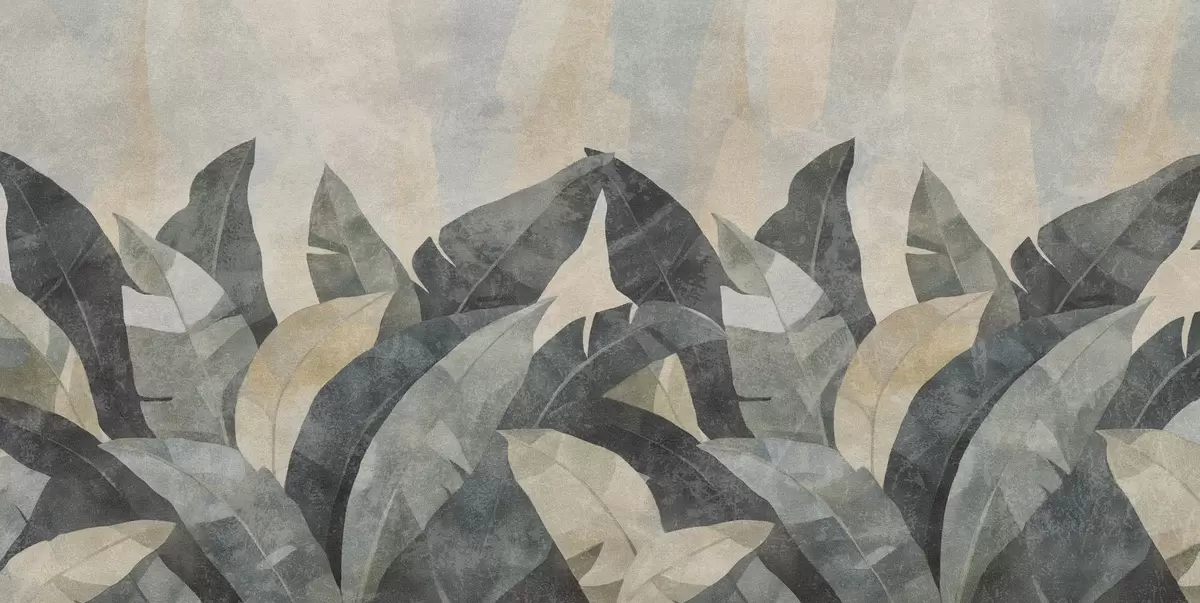 Murais de parede folhas de bananeira com textura em tons naturais de bege, verde e cinzento Nr. w04285