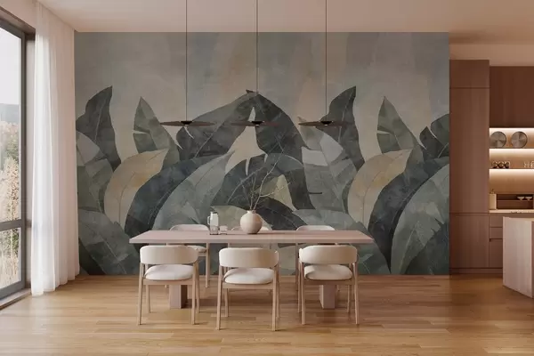 Murais de parede folhas de bananeira com textura em tons naturais de bege, verde e cinzento Nr. w04285