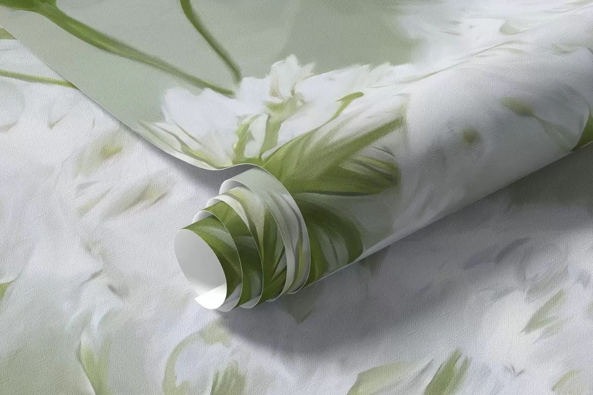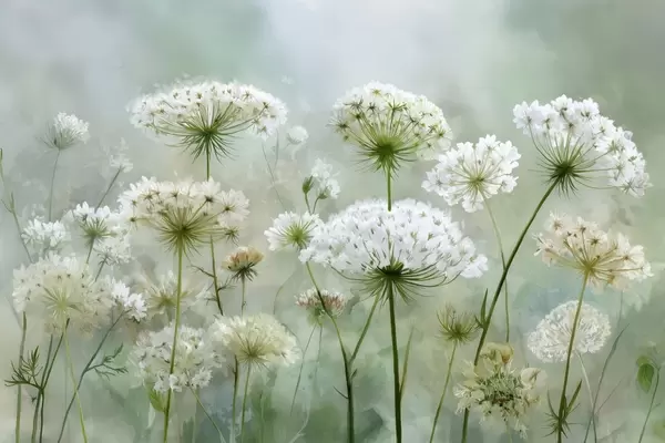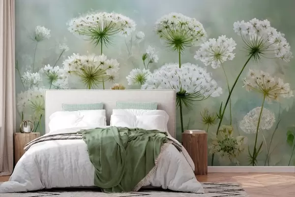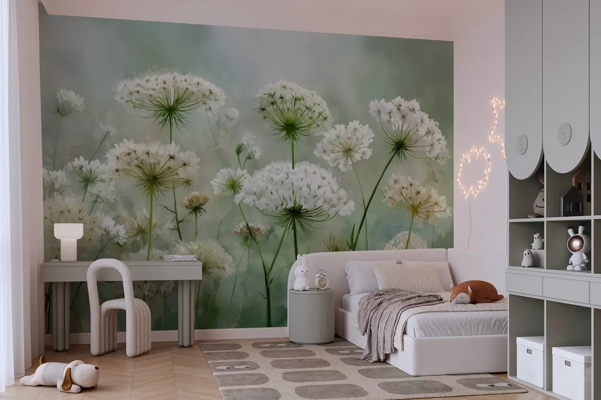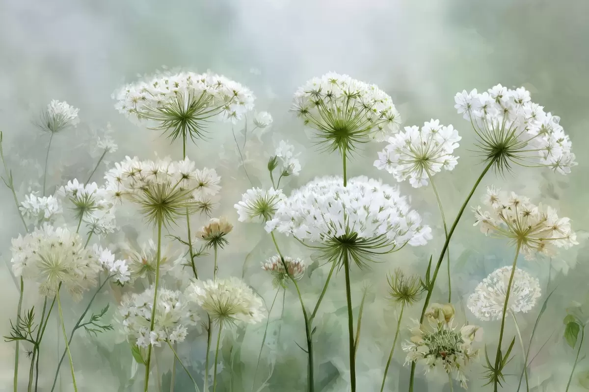 Murais de parede delicadas flores silvestres brancas Queen Anne, num estilo pitoresco, tons verdes Nr. w04313