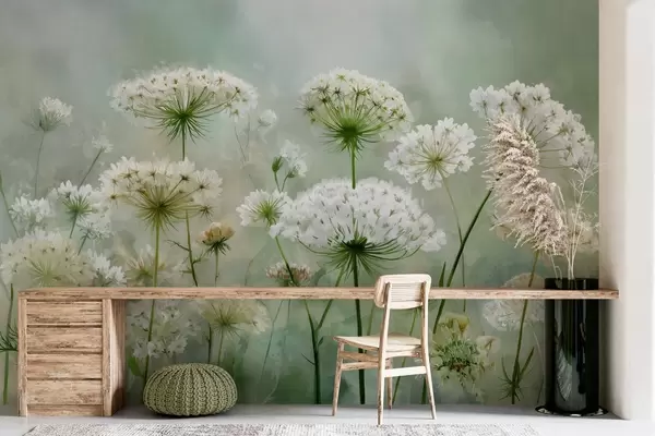 Murais de parede delicadas flores silvestres brancas Queen Anne, num estilo pitoresco, tons verdes Nr. w04313