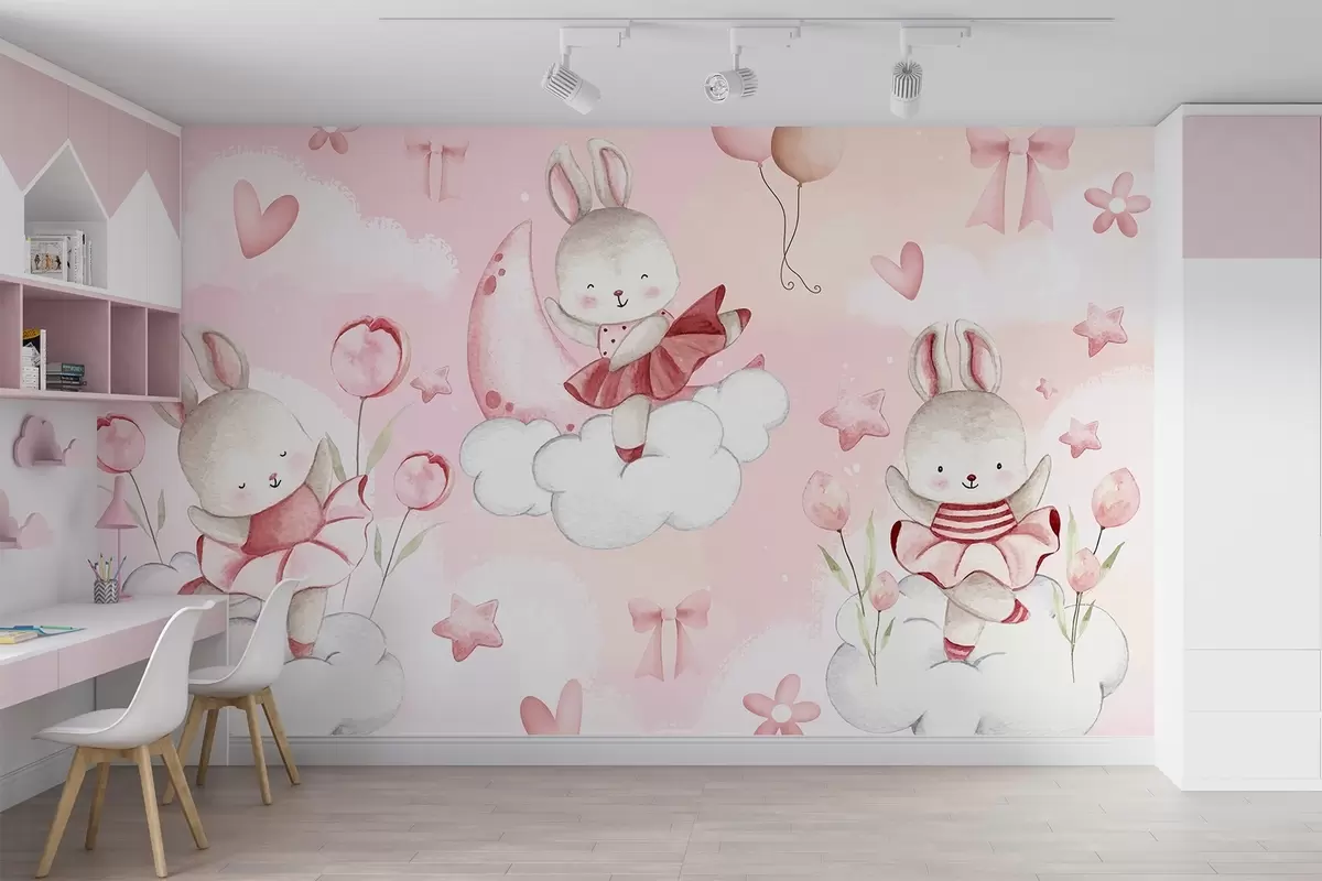 Murais de parede Coelhos com vestidos de ballet cor-de-rosa nas nuvens Nr. w04333