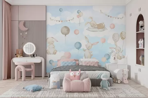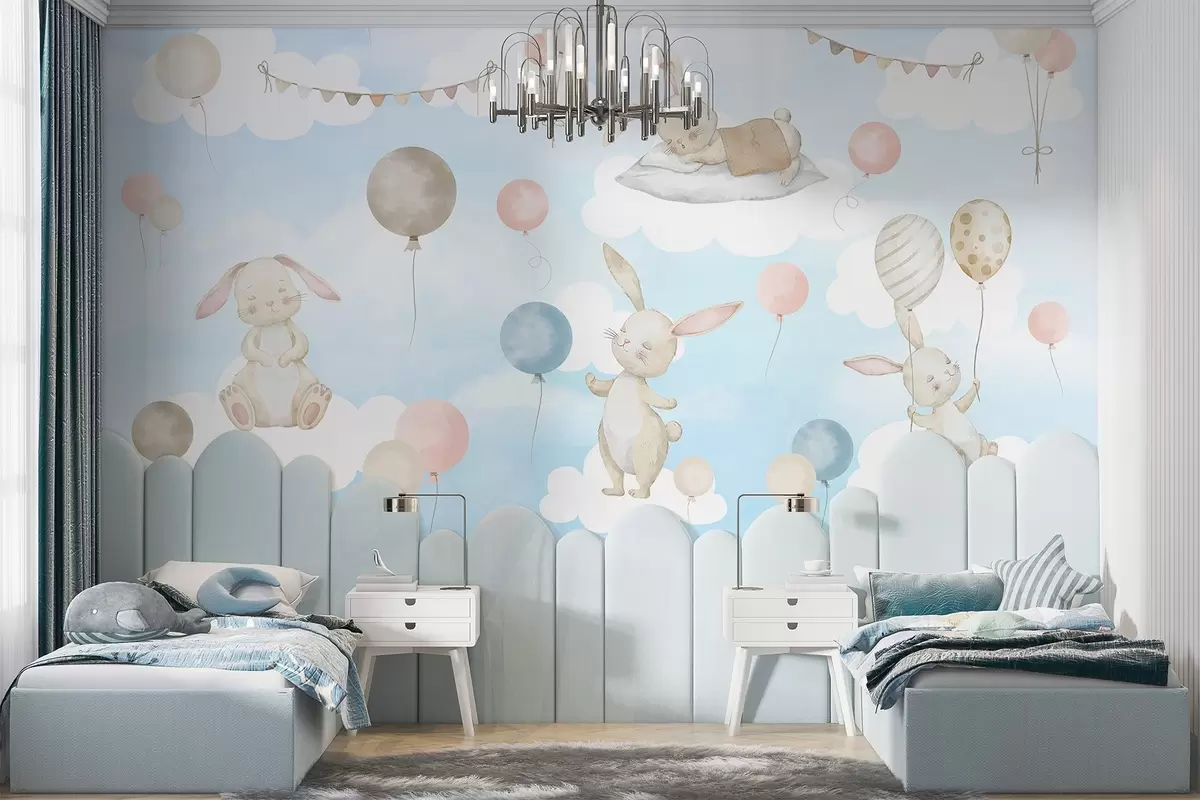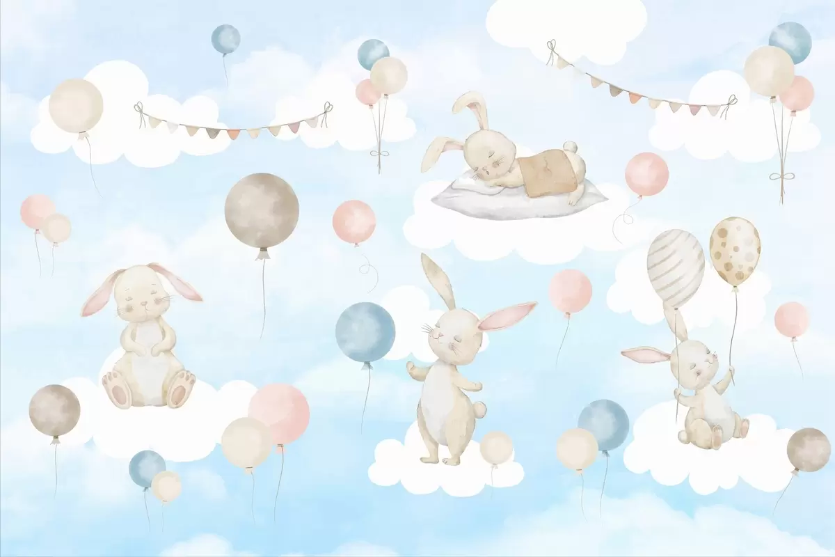 Murais de parede Coelhos com balões nas nuvens Nr. w04337