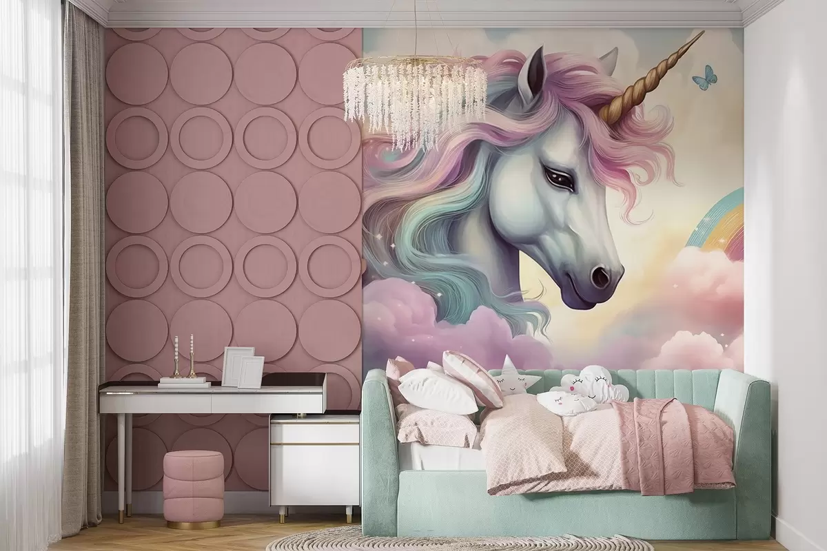 Murais de parede Unicórnio num céu nublado com um arco-íris Nr. w04372