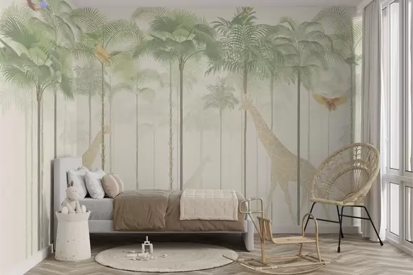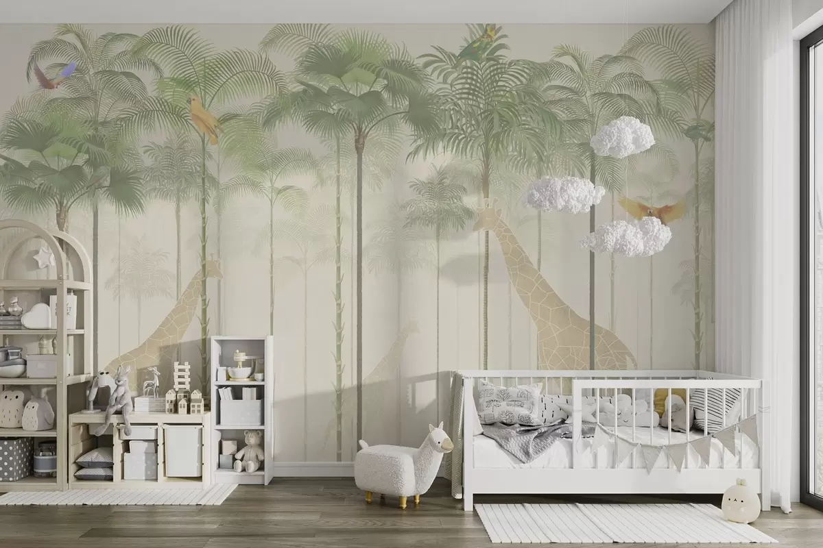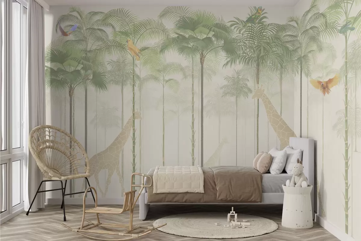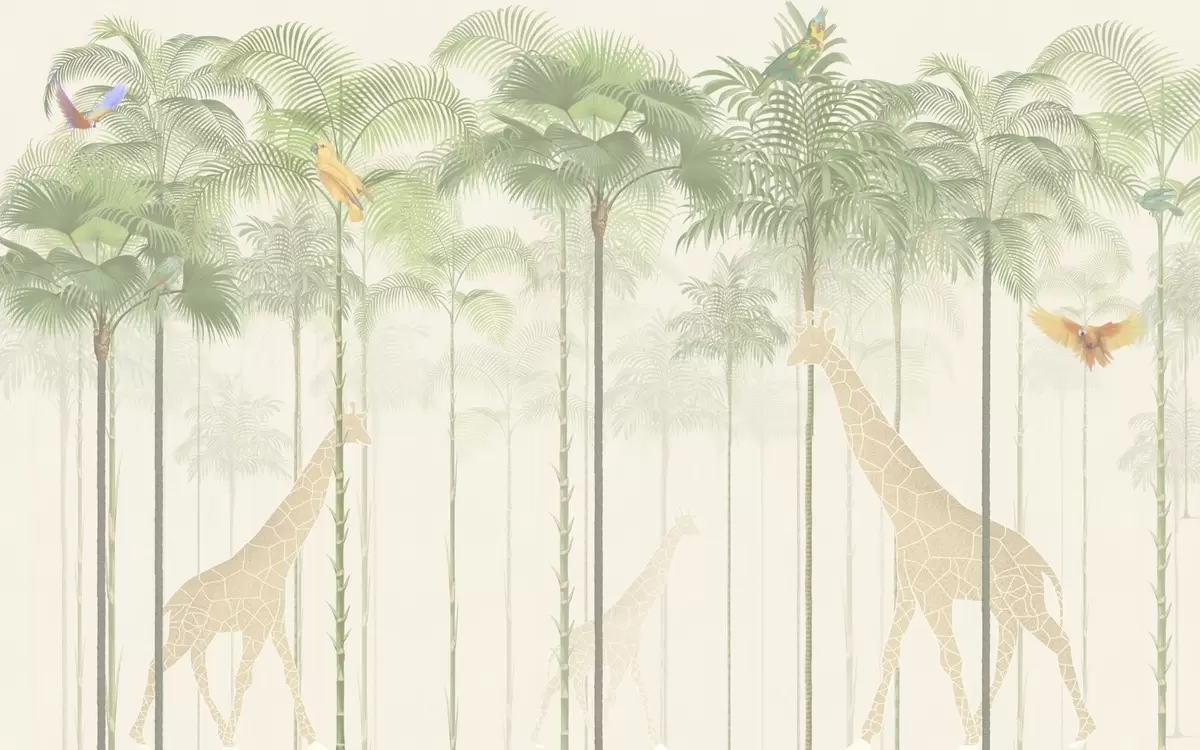 Murais de parede Girafas e aves tropicais entre palmeiras altas Nr. w04400